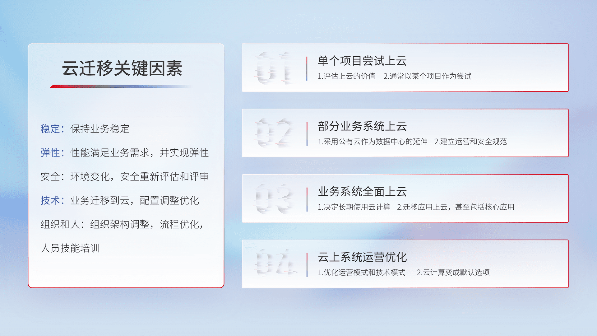 结合实际业务,,从规划设计、、云平台选型、、、云原生改造、、、数据迁移、、、、集成交付,,,,迁移全过程为客户识别最佳上云路径,,,,做好风险识别管理,,,设计网络架构、、、、身份权限、、安全审计合规、、、操作审计、、日志审计、、、、监控告警策略、、、多站点容灾设计等,,,,对云上基础设施进行整体规划,,提升IT治理水平,,以满足弹性、、、高可用、、高性能的需求。。。