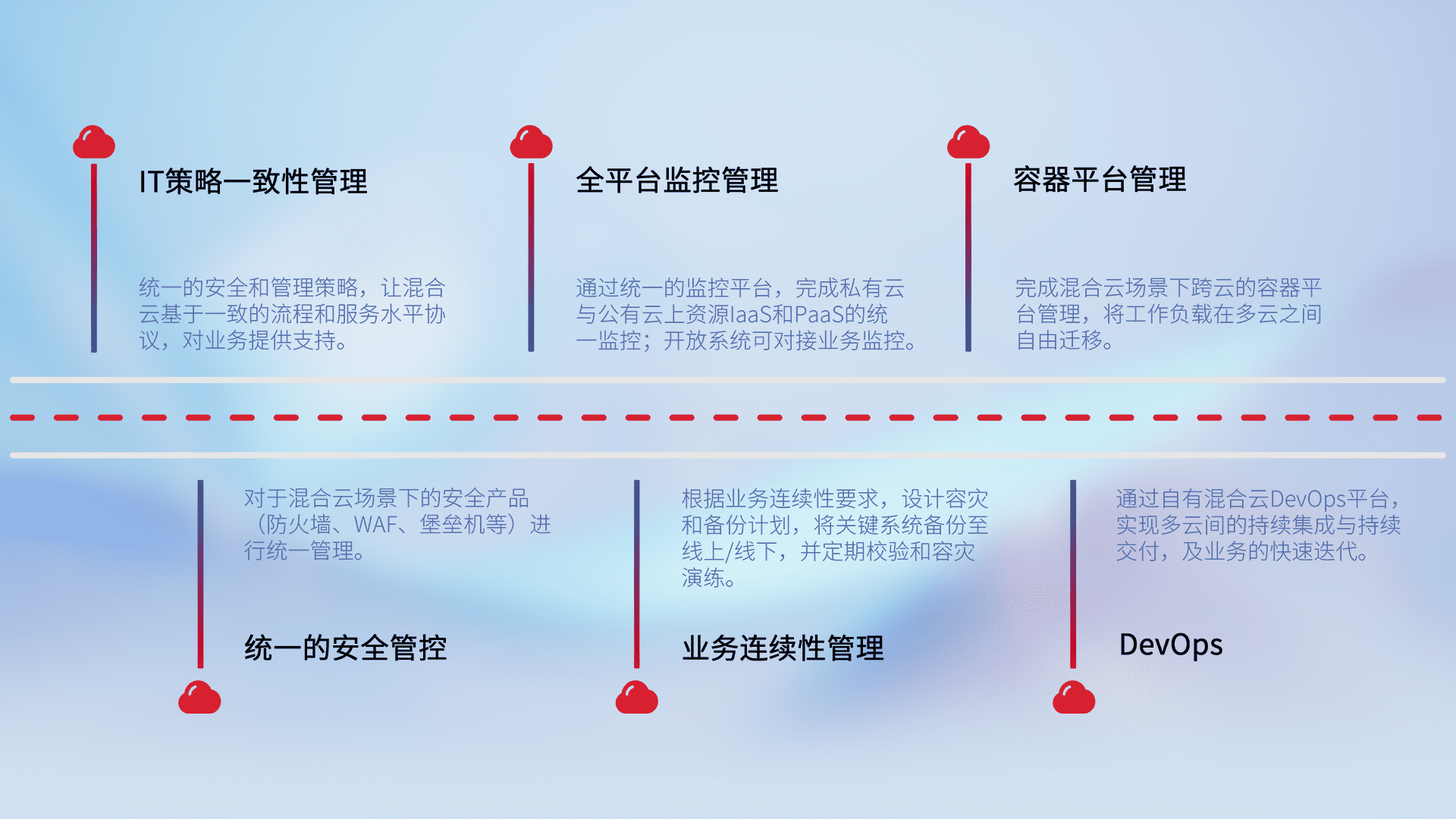 通过多云纳管,,,以统一的资源数据模型把客户的云资源进行抽象和封装,,,,进而实现对多云资源的统一操作,,保障云资源管理的可靠性、、稳定性与可用性。。。。量身定制化运维内容,,,,配置、、开发运维、、补丁管理、、、备份、、、监控、、、、认证和访问管理、、审计和日常巡检等,,,保障在用云过程中的可靠度,,,,稳定度以及高可用率。。。